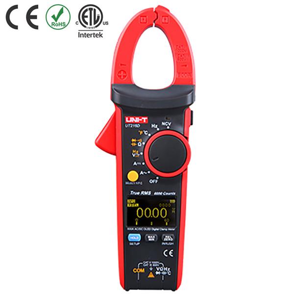 UT216D to cyfrowy multimetr uniwersalny produkcji Uni-t. Oferowany miernik cęgowy UT216D umożliwia wykonanie najczęściej mierzonych parametrów elektrycznych: pomiar prądu DC/AC cęgami bez konieczności przerywania obwodu elektrycznego, oraz pozostałe parametry przewodami pomiar napięcia DC/AC, pomiar częstotliwości, pomiar temperatury, pomiar ciągłości obwodu elektrycznego, pomiar oporności, pomiar pojemności kondensatorów. UT216D mierzy wartość skuteczną napięcia True RMS i prądu zmiennego AC. Za pomocą miernika UT216D sprawdzimy diody półprzewodnikowe. Z dodatkowych funkcji mamy możliwość zarejestrowania wartości MAX i MIN w trakcie trwania pomiaru, funkcję zatrzymania wskazania na wyświetlaczu Data HOLD, funkcje REL czyli pomiarów względnych pozwalający wyzerować wskazania miernika. Multimetr UT216D wyposażony jest w wyświetlacz OLED o maksymalnym wskazaniu wyniku pomiarowego 6000. Miernik cęgowy UT216D ma funkcję NCV (No Contact Voltage) pozwalającą na bezprzewodowe wykrywanie napięcia AC - wskaźnik występowania napięcia AC.
