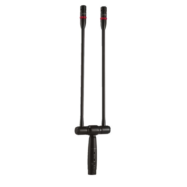 Podwójne mikrofony elektretowe na gęsiej szyi, ze świecącym na czerwono pierścieniem