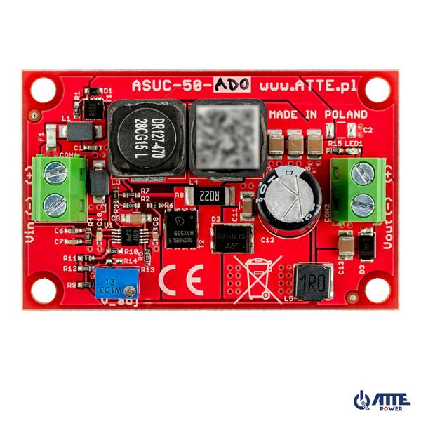 ASUC-50-AD0-OF to wysokosprawna, nieizolowana przetwornica DC/DC podnosząca napięcie. Przetwornica pozwala na pracę w szerokim zakresie napięć wejściowych i posiada precyzyjną regulację napięcia wyjściowego. Typowym zastosowanie mmodułu jest wytwarzanie napięcia zasilającego PoE48 VDC z napięcia 12 VDC lub 24 VDC pochodzącego z zasilacza buforowego.