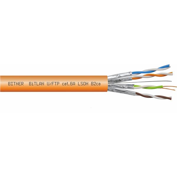 Bezhalogenowe kable do sieci teleinformatycznych o podwyższonych wymaganiach przeciwpożarowych. BiTLAN U/FTP cat.6A LSOH B2ca przeznaczone są do pracy w sieciach komputerowych, w których wykorzystywane jest pasmo częstotliwości do 500MHz. Przeznaczone są do transmisji danych, dźwięku i obrazu telewizyjnego o przepustowości binarnej do 10Gb/s. Indywidualnie ekranowane pary folią Al/Pet dodatkowo wpływają na poprawę parametrów teletransmisyjnych niwelując zakłócenia zewnętrzne oraz występujące między parami dlatego można je stosować w sieciach przemysłowych narażonych na oddziaływanie zewnętrznych zakłóceń elektromagnetycznych. Kable stosuje się do ułożenia na stałe w tzw. okablowaniu strukturalnym wewnątrz budynków zgodnie ze standardem PN-EN 50173-1, ISO/IEC 11801-1, ANSI/TIA 568-C.2. Posiadają powłokę bezhalogenową LSOH nierozprzestrzeniającą płomienia o bardzo niskiej emisji dymów wg EN 50268, IEC 61034-1(2) i o ograniczonym wydzielaniu gazów korozyjnych wg EN 50267, IEC 60754-2, która umożliwia zastosowanie kabla w miejscach o podwyższonych wymaganiach przeciwpożarowych. Kable sklasyfikowane zgodnie z normą PN-EN 50575 (CPR) o klasie reakcji na ogień B2ca.