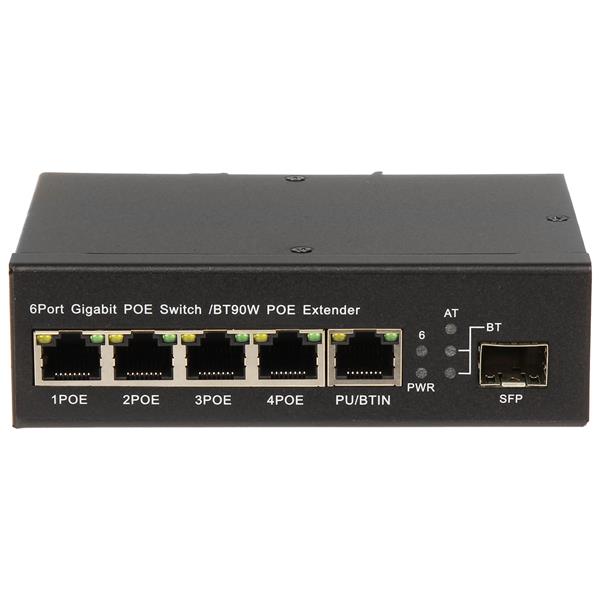 Urządzenie SPT-POE/4-POE-BT to gigabitowy switch, który może być zasilany z wykorzystaniem portu Uplink - PU/BTIN z zasilacza PoE 802.3bt. Dodatkowo na każdym porcie switcha dostępne jest zasilanie PoE 802.3af/at/bt dla podłączonych urządzeń.