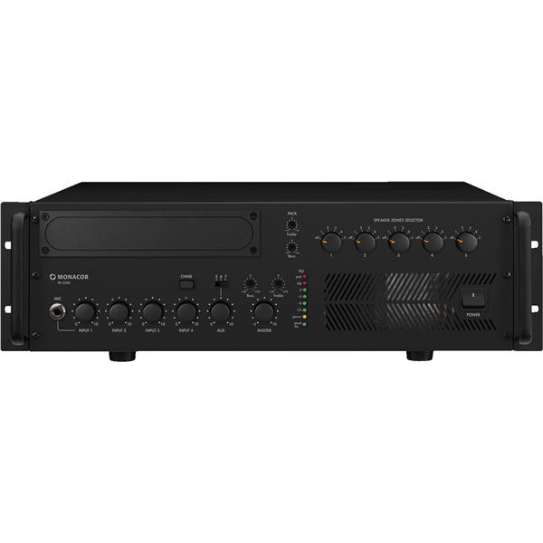 | Złącza | 2 x 6.3mm (mic), 1 x Combo 6.3mm/XLR (mic/line), 3 x RCA L/R (line), terminale śrubowe (line), 1 x 6.3mm (przedwzmacniacz), terminale śrubowe (mikr. push-to-talk), terminale śrubowe (mikr. strefowy), terminale śrubowe (głośniki), 1 x 6.3mm (wyjście przedwzmacniacza), terminale śrubowe (przycisk gongu) |