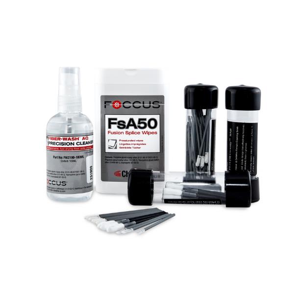 Zestaw profesjonalnych produktów czyszczących Chemtronics dla użytkowników spawarek światłowodowych.