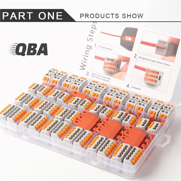 Wielorazowego zastosowania szybkozłączki instalacyjne Safe QBA zapakowane 94szt w wygodnym pudełku stosowane są przy łączeniu przewodów elektrycznych w puszkach elektroinstalacyjnych, w maszynach, w lampach, szafkach rozdzielczych i innych pracach elektroinstalacyjnych nawet nisko prądowych.
